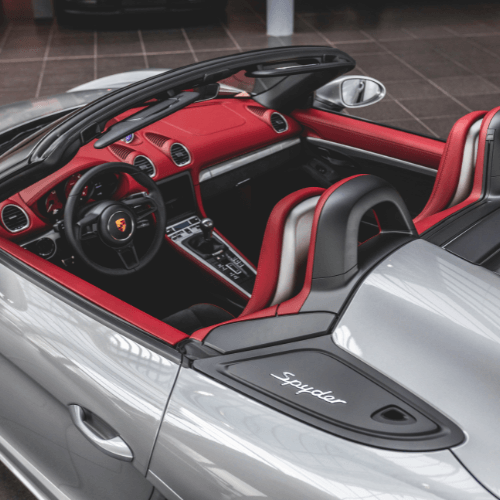 Bert Vis (64) is een enorme auto- en motorliefhebber in het algemeen en een Porsche-gek in het bijzonder. Hij kocht bij Porsche Centrum Leusden een nieuwe 718 Spyder. De auto van Bert is niet alleen uniek vanwege zijn sporthart in het midden, maar ookvanwege zijn opties. Of liever gezegd: het gebrek daaraan. Bert Vis wilde zijn Spyder zo kaal mogelijk. “Dichter bij de oorsprong kom je niet dan met deze auto.”