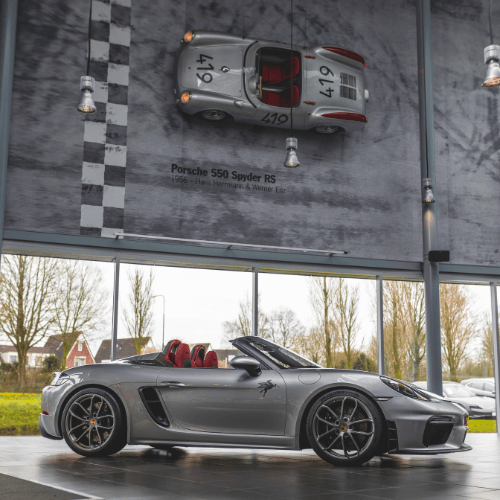 De Spyder was vorig jaar al in Leusden binnen gekomen, maar hij is pas in januari op kenteken gezet. Ik heb ‘m pas recentelijk opgehaald; die auto mocht absoluut niet door de pekel. Ik keek lang uit naar het moment dat ik ‘m samen met Marjo kon ophalen en lekker met de kap open naar huis kon rijden via lekkere binnendoorweggetjes. Het was een feestje. Deze pure auto doe ik nooit meer weg. Hij is precies zoals ik wil dat ‘ie is. Ik denk dat er meer mensen zijn die een kale auto willen. Natuurlijk zijn er ook mensen die er heel anders over denken; die zien een Porsche het liefst met alle leverbare extra’s. Iemand zag de auto hier in de showroom staan en vroeg: welke mafkees heeft die kale Spyder besteld? Ik zei: hier zit ‘ie.”