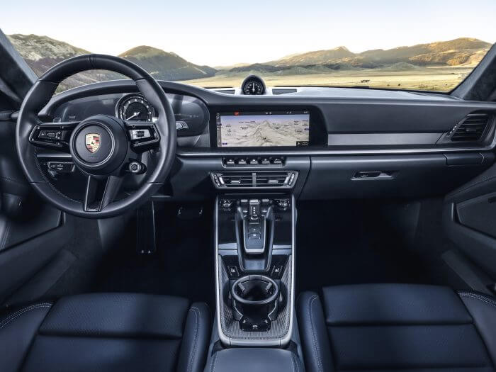 Het compleet nieuwe interieur wordt gekenmerkt door heldere en rechte lijnen van het dashboard met verzonken instrumenten. De designers lieten zich hierbij inspireren door de Porsche 911-modellen uit de jaren zeventig. Naast de centraal geplaatste analoge toerenteller die typisch is voor Porsche, bieden twee dunne en frameloze displays de bestuurder de benodigde informatie. Het tot 10,9 inch vergrote middenscherm van het Porsche Communication Management (PCM) is dankzij de nieuwe indeling snel en veilig te bedienen. Onder het scherm van het PCM bevinden zich vijf knoppen waarmee eenvoudig toegang kan worden verkregen tot de belangrijkste voertuigfuncties. Op het gebied van digitalisering zet de 911 de volgende stap naar de toekomst met permanente connectiviteit en nieuwe functies en diensten. De standaard PCM-functies omvatten online navigatie op basis van zowel zwermdata als Porsche Connect Plus.