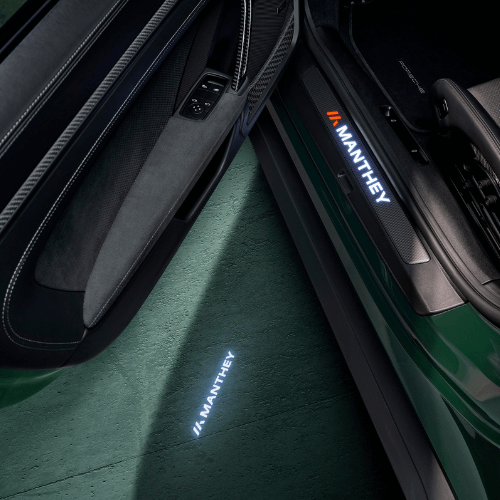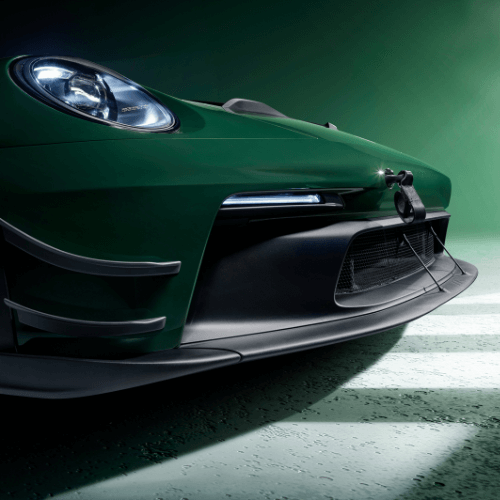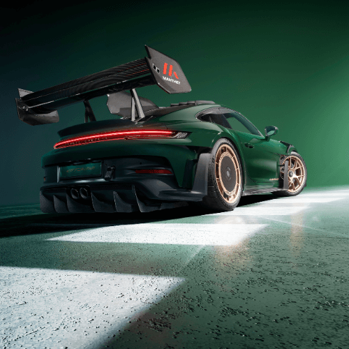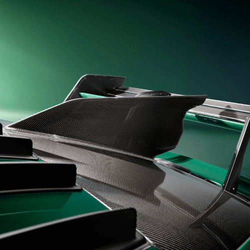 De grondige aerodynamische verbeteringen geven de Manthey Kit voor de Porsche 911 GT3 RS een uniek en herkenbaar uiterlijk. Koolstofvezel versterkt de fors vergrote spoilerlip met een nieuw vleugelprofiel. Samen met de verbeterde Gurney flaps in de wielkasten en twee kleine aerodynamische vleugeltjes aan weerszijden van de voorbumper verhoogt deze spoilerlip de neerwaartse druk op de vooras. Een 25% lichtere plaat van koolstofvezel vervangt de achterruit en bevat een geïntegreerde koolstofvezel ‘shark fin’, geïnspireerd op de World Sportscar Championship-winnende Porsche 963, wat de stabiliteit in bochten verbetert. Zes extra dakvinnen leiden warme lucht van de voorste radiator naar buiten en zorgen ervoor dat koelere lucht efficiënt de achterzijde bereikt, zelfs onder extreme rijomstandigheden.