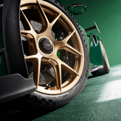 Het gesplitste koolstofvezel DRS-vleugelelement, samen met grotere en verbeterde zijkanten van de achtervleugel (de zogenaamde eindplaten), verhoogt de neerwaartse druk op de achteras. De aanzienlijk bredere achterdiffuser met langere vinnen van koolstofvezel verhoogt ook de neerwaartse druk zonder de luchtweerstand te vergroten. De koolstofvezel ‘Aerodiscs’ op de achterwielen verminderen de luchtweerstand en vullen de overige aerodynamische onderdelen perfect aan. Samen zorgen deze componenten voor een optimale luchtstroom en maximale efficiëntie. Bij 285 km/u genereert de 911 GT3 RS met Manthey Kit meer dan 1.000 kg neerwaartse druk, wat hogere snelheden in snelle en middellange bochten mogelijk maakt en de stabiliteit maximaliseert.